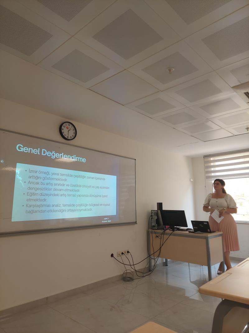 Siyaset Bilimi ve Kamu Yönetimi Bölümü tarafından düzenlenen bölüm seminerleri kapsamında, 22 Nisan 2026 Çarşamba günü saat 13.00’te B-203 no’lu derslikte Arş. Gör. Başak IŞILDAKLI KIRŞAN tarafından “Yerel Siyasette Temsilde Çeşitlilik: Belediye Meclis Üyelerinde Yaş, Cinsiyet ve Öğrenim Durumu Dağılımında İzmir Örneği” başlıklı bir sunum gerçekleştirilmiştir.
