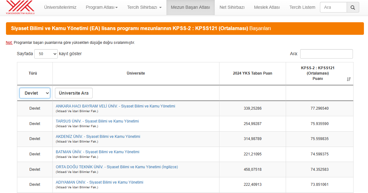 Yükseköğretim Kurulu (YÖK) Mezun Başarı Atlası 2025 verilerine göre Kamu Personeli Seçme Sınavı (KPSS)’nda KPSS 121 (Ortalaması) Puanı alanında Fakültemiz Siyaset Bilimi ve Kamu Yönetimi Bölümü 75,93559 puanla Kamu Yönetimi ile Siyaset Bilimi ve Kamu Yönetimi Bölümleri arasında KPSS başarı puanı sıralaması ortalamasına göre devlet üniversiteleri arasında ikinci olmuştur.